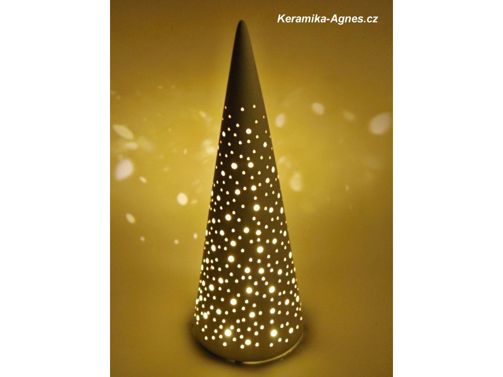 Keramický děrovaný svícen ve tvaru kuželu s keramickou podmiskou na čajovou svíčku nebo led světýlko.