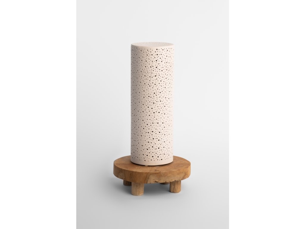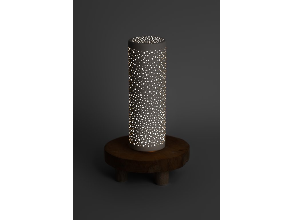 Keramický děrovaný svícen ve tvaru válce s keramickou podmiskou na čajovou svíčku nebo led světýlko.